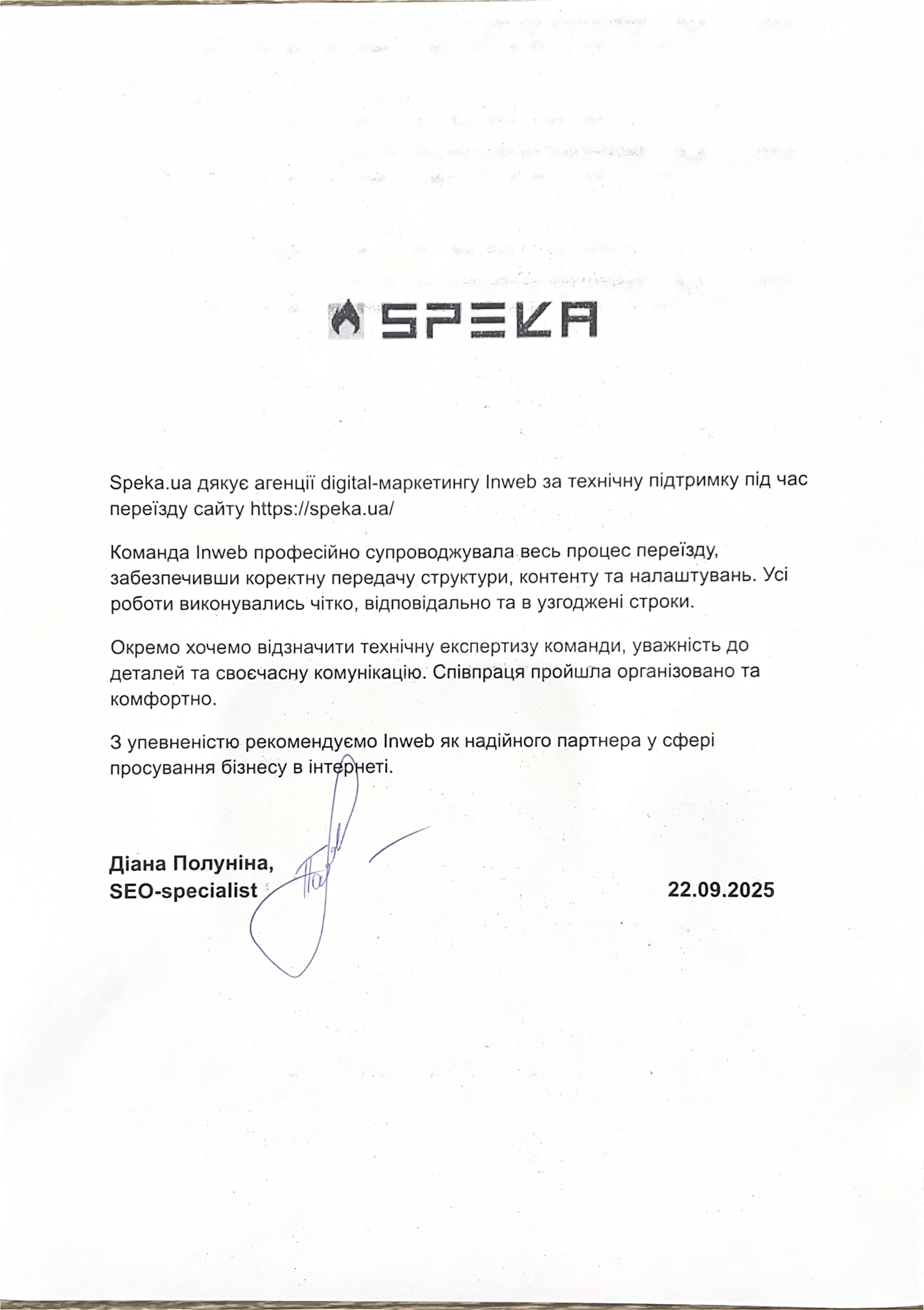 Speka.ua благодарит агентство digital-маркетинга Inweb за техническую поддержку во время переезда сайта https://speka.ua/