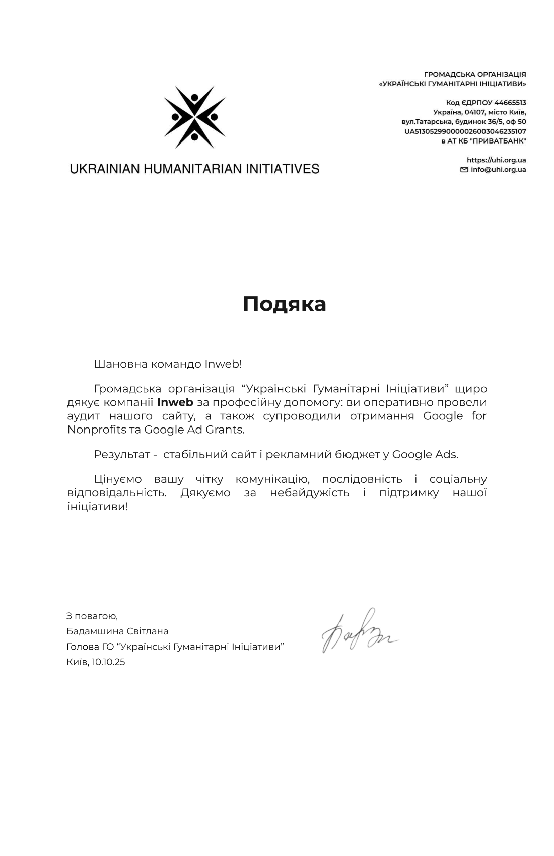 Общественная организация «Украинские гуманитарные инициативы» искренне благодарит компанию Inweb за профессиональную помощь: вы оперативно провели аудит нашего сайта, а также сопроводили получение Google for Nonprofits и Google Ad Grants.