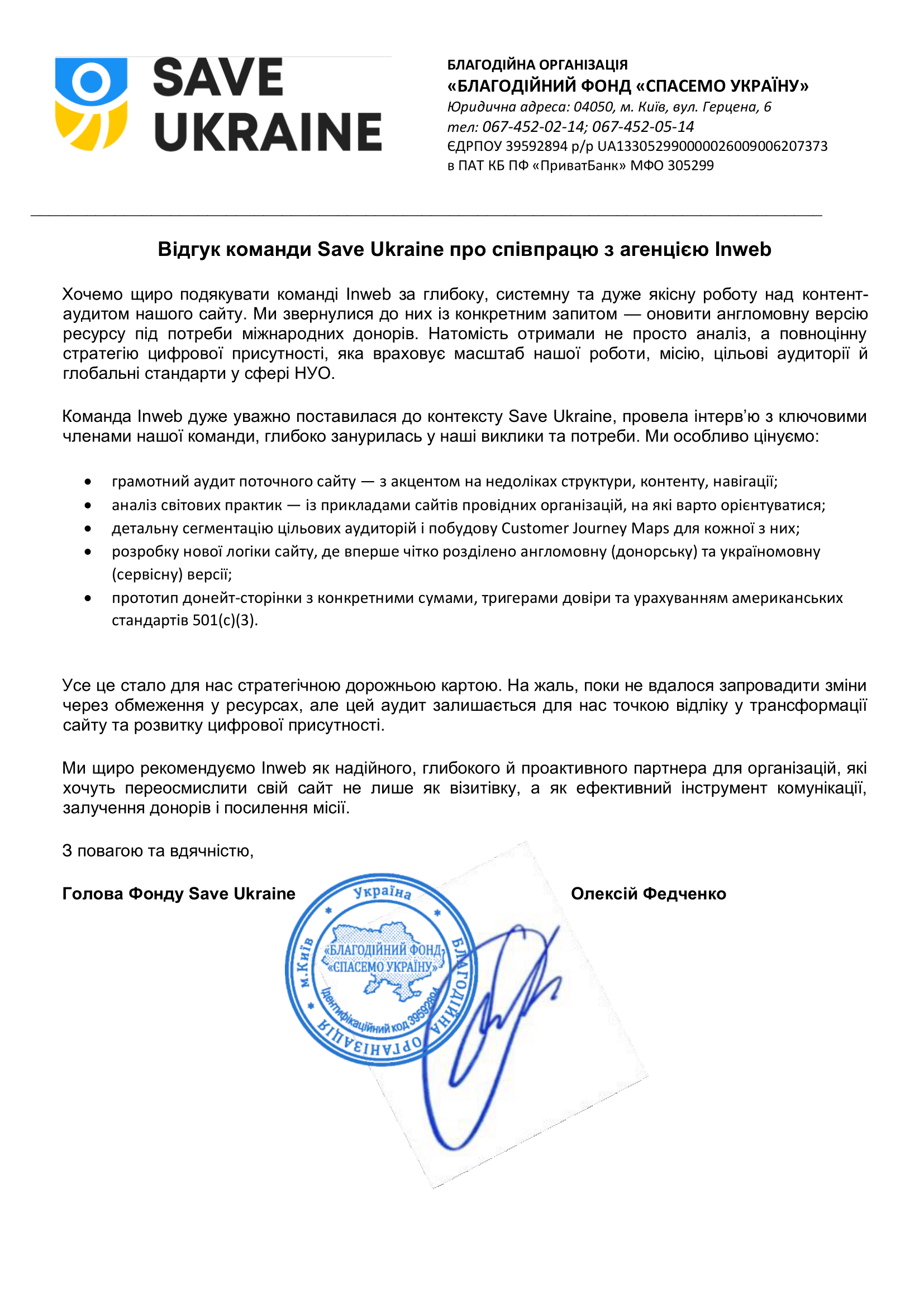 Команда Inweb дуже уважно поставилася до контексту Save Ukraine, провела інтерв’ю з ключовими членами нашої команди, глибоко занурилась у наші виклики та потреби. Ми особливо цінуємо: • грамотний аудит поточного сайту — з акцентом на недоліках структури, контенту, навігації; • аналіз світових практик — із прикладами сайтів провідних організацій, на які варто орієнтуватися; • детальну сегментацію цільових аудиторій і побудову Customer Journey Maps для кожної з них; • розробку нової логіки сайту, де вперше чітко розділено англомовну (донорську) та україномовну (сервісну) версії; • прототип донейт-сторінки з конкретними сумами, тригерами довіри та урахуванням американських стандартів 501(c)(3).