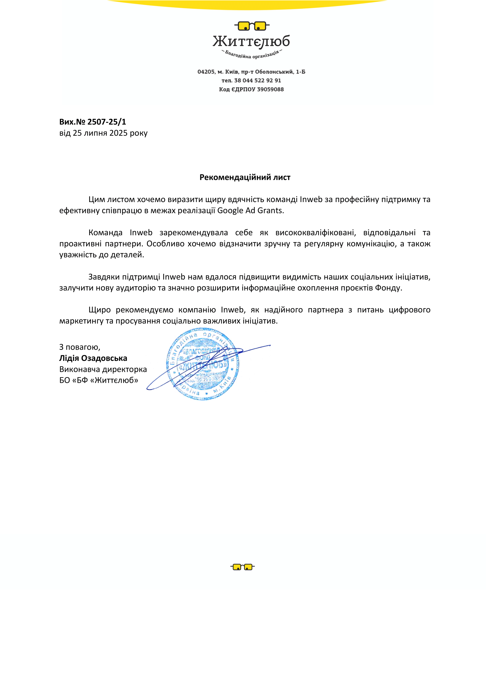 Команда Inweb підтримує грантовий акаунт фонду та забезпечує його ефективну роботу. Її професіоналізм та уважність допомогли нам досягти кращих результатів у рекламних кампаніях. Співробітники Inweb дуже відповідально підходять до своєї роботи — вони завжди на зв'язку та готові допомогти з будь-якими питаннями.